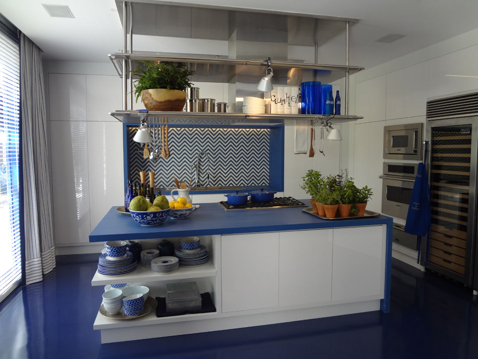 Num ambiente totalmente clean, o piso azul veio para dar destaque maior aos móveis.